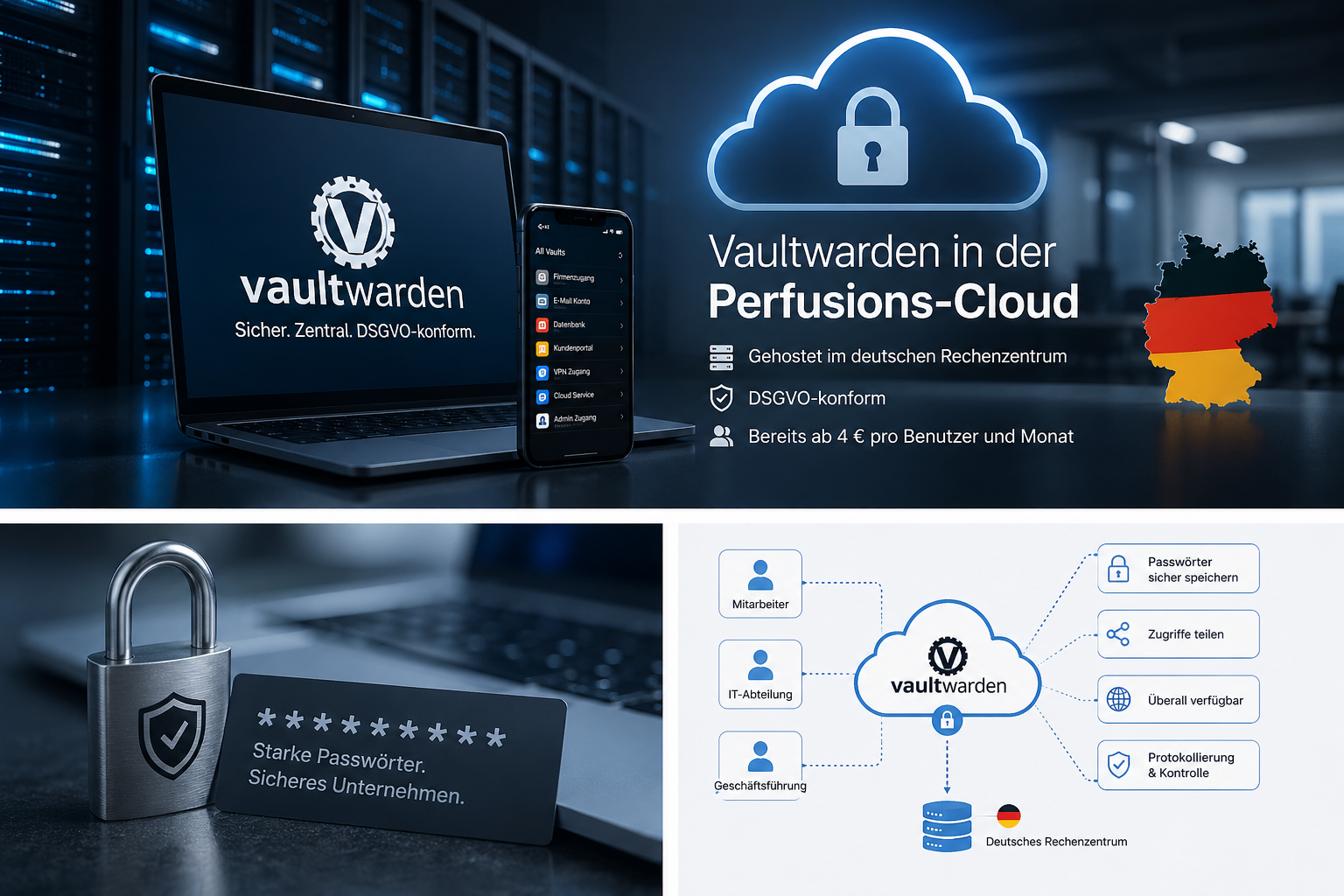 Passwörter gehören nicht in Excel-Listen, Browser-Speicher oder Notizzettel. Trotzdem werden Zugangsdaten in vielen Unternehmen noch immer unstrukturiert geteilt, mehrfach verwendet oder unsicher abgelegt. Genau hier setzt unser gehosteter Vaultwarden-Service in der Perfusions-Cloud an: eine moderne, zentrale und wirtschaftliche Lösung für professionelles Passwortmanagement – betrieben in einem deutschen Rechenzentrum und ausgerichtet auf die Anforderungen der DSGVO.